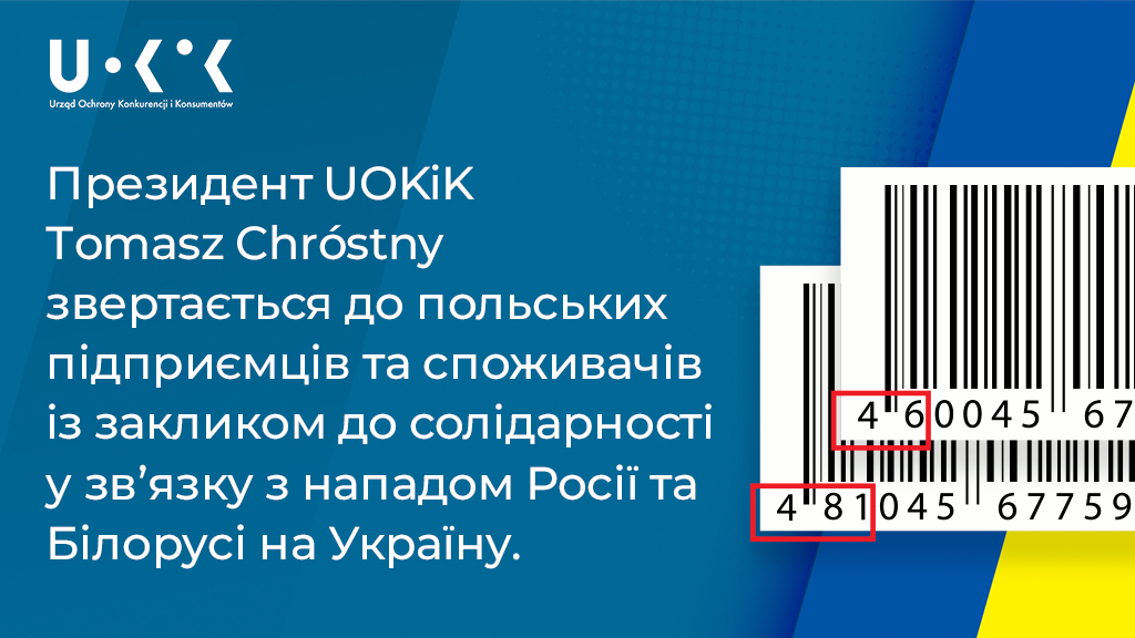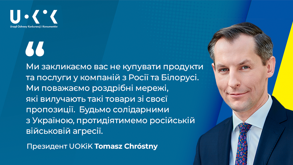 –Ми закликаємо вас не купувати продукти та послуги у компаній з Росії та Білорусі. Ми поважаємо роздрібні мережі, які вилучають такі товари зі своєї пропозиції. Будьмо солідарними з Україною, протидіятимемо російській військовій агресії – каже Президент UOKiK Тоmasz Chróstny.